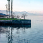They warn me about the snow as I cross the border. I choose not to believe them. My non-believing only works out a little as I dash through some snow indeed. I rub my hands and cycle on. I reach the lake from Struga town side… This place is trying to put on a resortey face, though there is plenty of Albanian chaos around. And everything is Albanian here, including the flags on top of the masts. Later I will hear stories of mutual distrust between Macedonians and Albanians living in Macedonia.