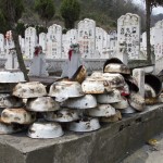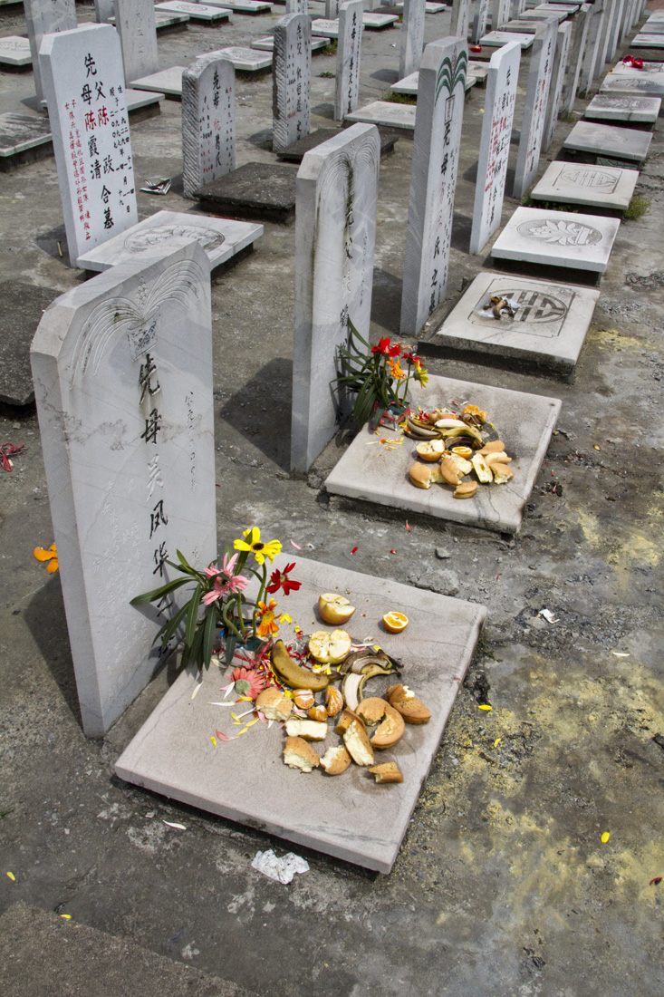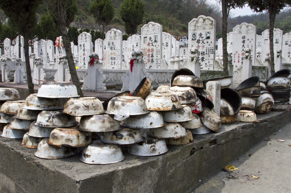 Tyle pięknej teorii, obecnie praktyka wygląda tak, że raz do roku cała rodzina się zjeżdża i idzie odkurzać groby (czasami porozrzucane po górach za miastem, coraz częściej poustawiane w rządku na cmentarzach) a potem wspólnie udaje się do knajpy, gdzie nie jest w stanie przejeść zamówionej góry jedzenia (marnotrawienie jedzenia w restauracjach to temat na osobną analizę) ani przepić hektolitrów baijiu (tradycyjny chiński napitek o mocy 52%). A potem wizyta na następnym cmentarzu, a potem jeszcze kolejnym… Nie wszystko pamiętam całkiem jasno – żar z nieba, gryzący dym, porozrzucane dookoła jedzenie, złożone w ofierze przodkom, sprzedawcy papierowych „pieniędzy dla zmarłych” skaczący po grobach w pogoni za potencjalnymi klientami, baijiu, dużo baijiu. Reszta na zdjęciach, wykonanych drżącymi rękami.